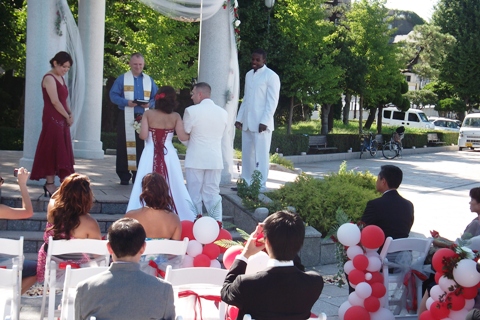 天気にも恵まれ、インターナショナルなウエディングに通行人の皆さんも立ち止まってその様子に見とれてしまうほどの素敵さ。私は野外ということもあり、音響機器の接続には発電機をセットしBGMで演出。恥ずかしながら自分でも感動してしまいました。