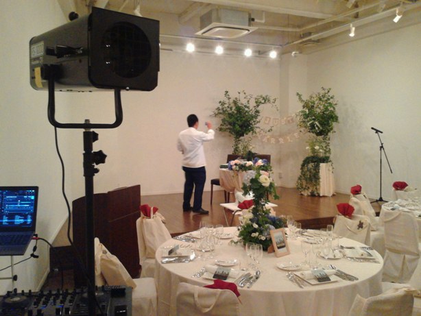4月は何といってもウエディングが多い!そんな中、会場を一から作ることが可能な提携会社のご依頼会場。準備時間にパッシャ!音響をやりながらのスポットライトが最近のマイブームです。